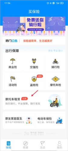完成注册并绑定微信后,系统会默认跳转至【保险】页面,此时点击页面上方的“摩托车租赁”选项即可。