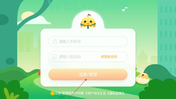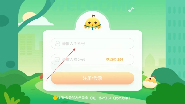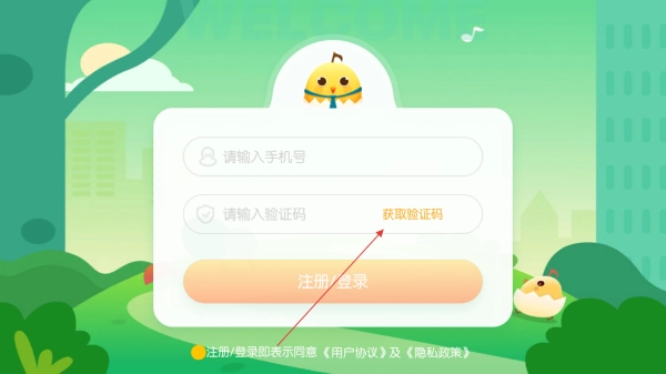 打开软件后,在登录页面输入手机号获取验证码,完成登录或注册操作,别忘了勾选同意用户协议和隐私协议哦。