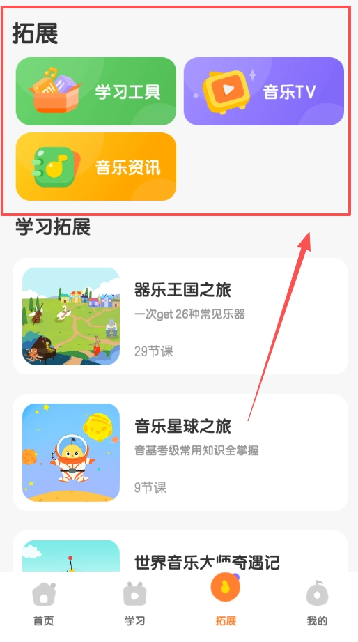 切换到拓展页面,这里设有器乐王国、音乐星球等多样的专题课程,可助力你认识各类乐器并学习乐理知识。