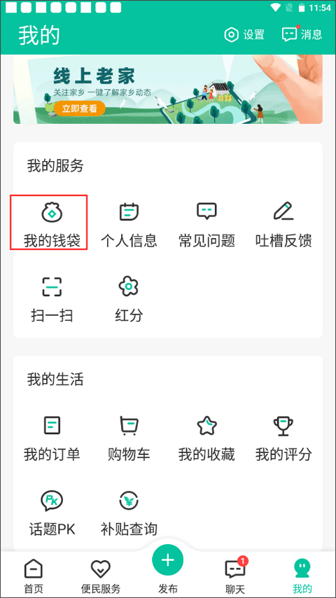 打开软件首页后,切换至“我的”界面,接着点击“我的服务”板块中的“我的钱袋”选项。