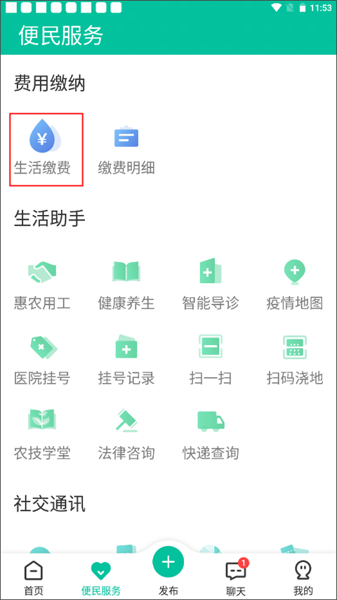 您可以点击下方菜单栏里的【便民服务】选项,这个板块整合了费用缴纳、生活助手、社交通讯等多个功能分区,接着在费用缴纳分类下找到并选择生活服务功能。