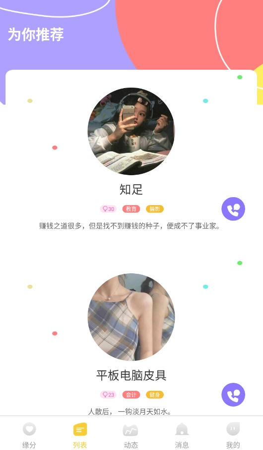 双悦这款交友软件挺靠谱的。可以找到附近的人聊天,分享生活中的趣事。操作特别简单,注册完成就能开始匹配。隐私保护做得很到位,聊天环境比较安全。无论是想认真交友还是打发时间,用它都挺合适。动态广场挺热闹的,遇到兴趣相投的人的概率比较高。单身想要扩大社交圈的话,下载下来试试挺有意思的。