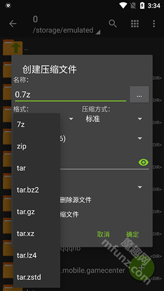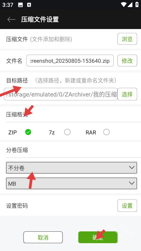 压缩设置界面支持编辑文件名、选择存储位置,压缩格式包含ZIP等多种选项,分卷压缩默认设置为不分卷模式,界面底部的确定按钮便于用户对各项参数进行精准配置。