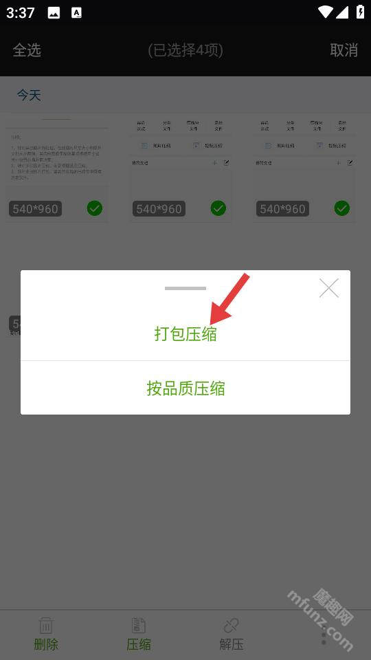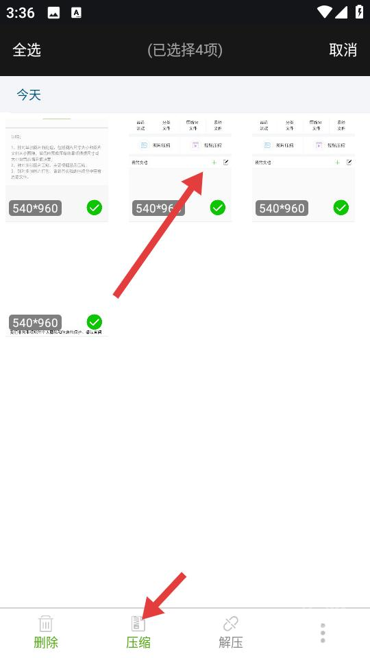文件管理界面呈现已选中的4项文件,缩略图旁边的绿色对勾标记着选中状态,底部的压缩按钮设计得较为醒目,便于进行批量处理操作。
