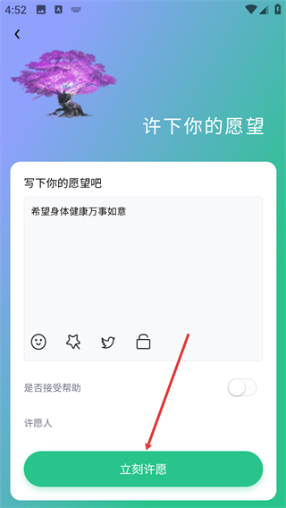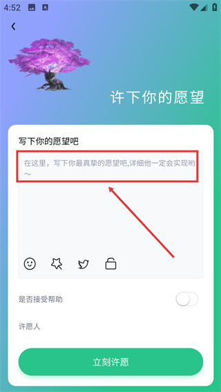 在愿望编辑框里,填写真诚的愿望内容,也能选择是否接受帮助之类的附加设置,让许愿信息更完整。