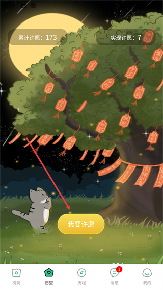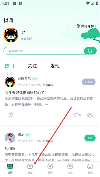 在【树洞】界面中,点击底部功能栏里的【愿望】选项,就能切换到愿望模块页面,进而参与许愿功能。