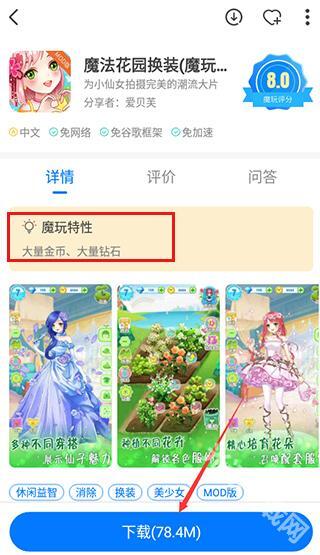 这里我挑选了魔法花园换装游戏,能看到已经调整为海量金币、海量钻石,接着点击最底部的就可以了。