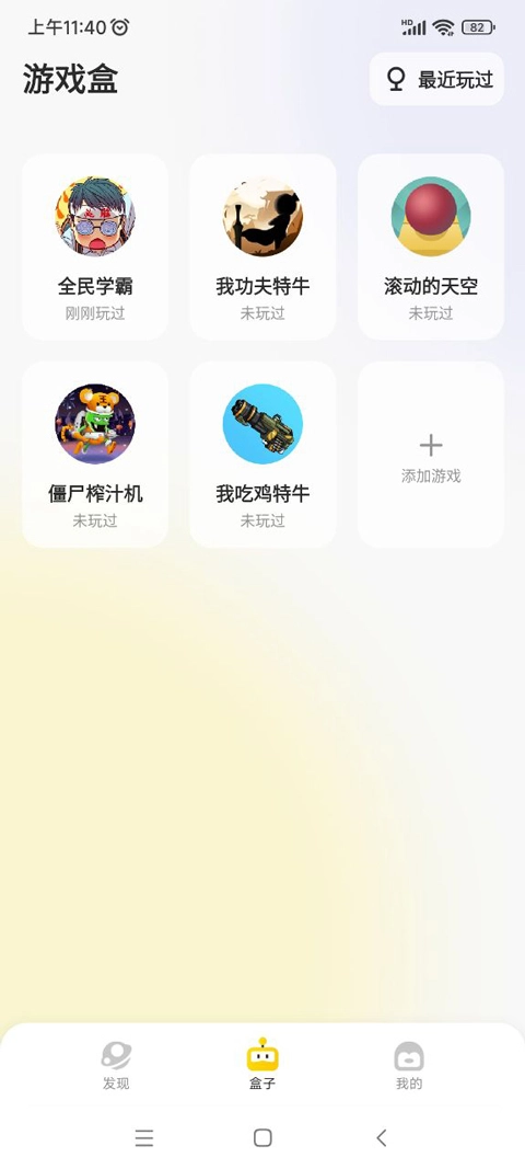 打开盒子后,玩家就能看到自己近期游玩过的游戏,像我最近就玩了全民学霸、我功夫特牛、滚动的天空这类热门游戏。