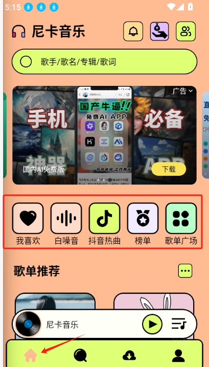 安装好尼卡音乐后,在应用的首页能看到“我喜欢”“白噪音”“抖音热曲”“榜单”“歌单广场”这几个栏目。