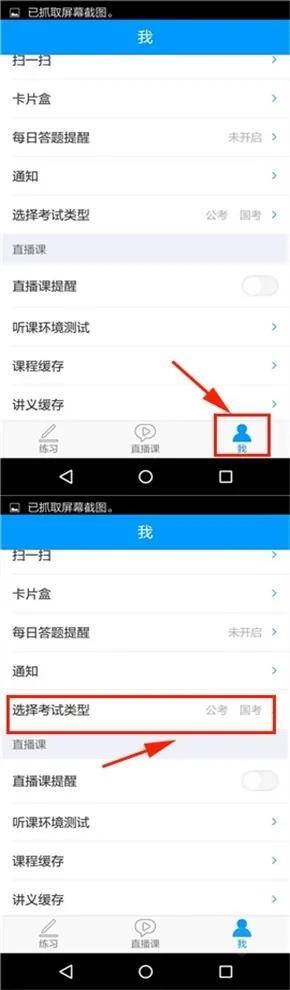 首先打开粉笔教师应用,点击界面右下角的【我】选项,接着点击【选择考试类型】,具体操作步骤可参照下方图示。