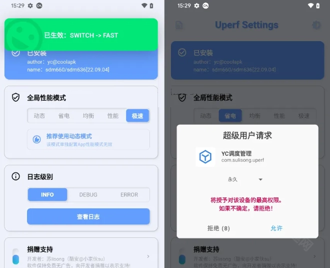 完成前两个步骤后,打开【YC调度管理】工具即可进行设置。这里最核心的是首页的【全局性能模式】卡片,所有调度调节功能都集中在此,首次使用时需授予ROOT权限。