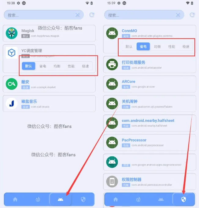 首先进行全局性能模式的调度设置,接着配置息屏调度和默认调度。完成上述选择后,通过底栏的第三个与第四个选项卡,即可针对单个应用单独调整其调度参数。