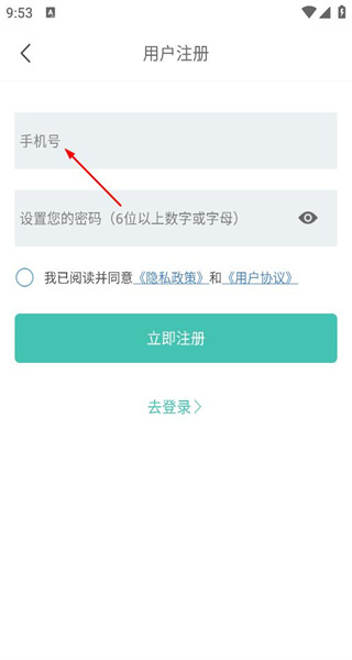 进入用户注册界面,填写手机号码与自行设置的密码,勾选相关协议后,点击立即注册的按钮。