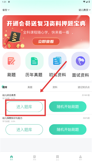 挑选对应的科目(例如幼儿综合素质),点击【进入题库】按钮,就能进入该科目的题目列表页面。