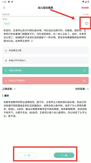 完成当前题目后,点击【下一题】按钮可以继续进行作答操作,点击【上一题】按钮则能够返回查看之前做过的题目。