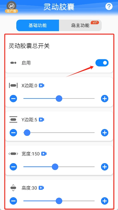 进入基础功能设置页面后,点击启用按钮,还能对灵动岛的位置和尺寸进行设置。