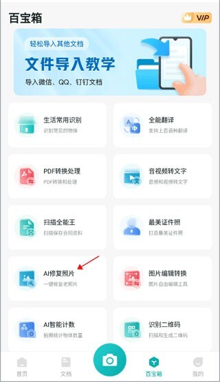 先打开进入,点击百宝箱,这里有不少功能,接着选择“AI修复照片”这个选项。