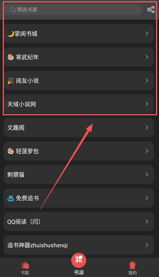 1、当你打开,看到书架上空空荡荡时,别着急。第一步,先前往“书源”处,勾选掌阅书城、QQ阅读这类书源。