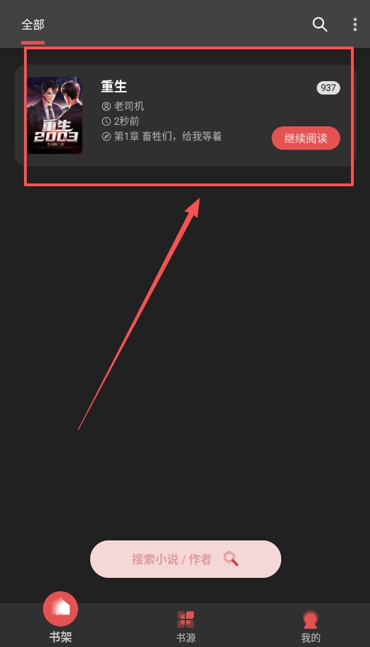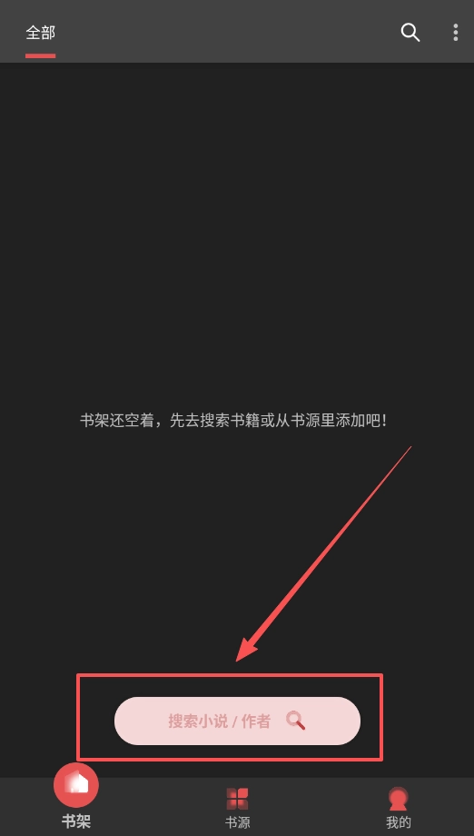 2、完成书源配置后,返回书架页面,点击“搜索小说/作者”,输入关键词,此时你刚刚添加的书源便会生效,助你从网络上找到并获取这本书。