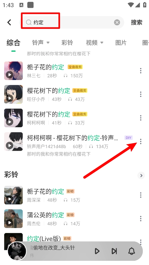 你也可以点击上方的搜索框,输入关键词搜索铃声,找到想要设置的铃声后,点击它右侧的三个点按钮。