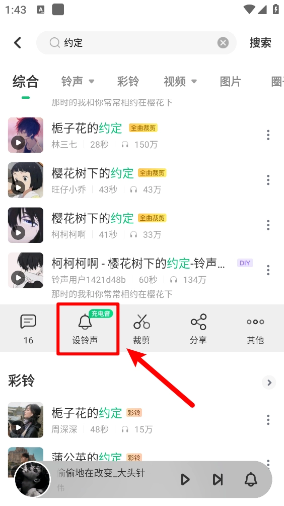 如图,选择并点击"设铃声"。