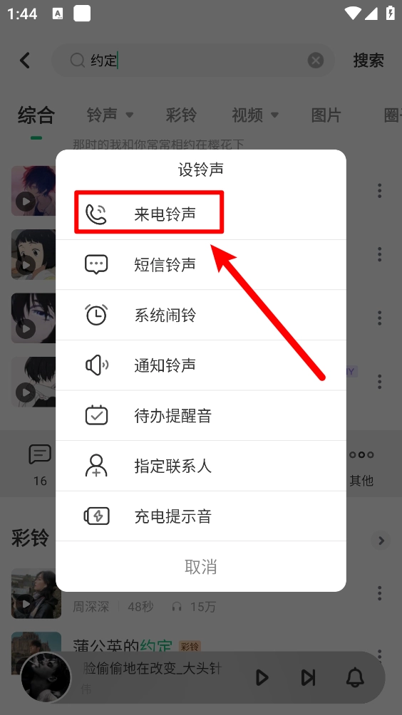弹出提示框,最后点击"来电铃声"即可。