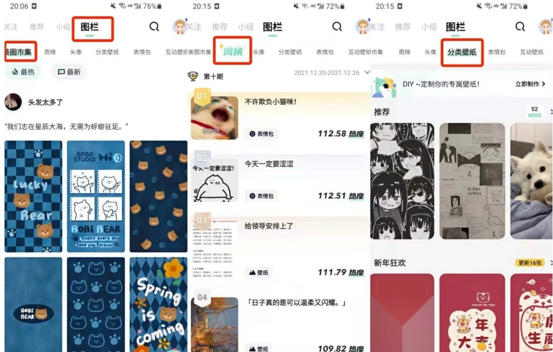 壁纸位于「图栏」页面,其分类包含:美图市集、周榜、头像、分类壁纸、表情包、互动壁纸、朋友圈背景、贴纸以及热门精选。