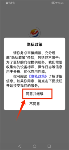 启动应用后,在隐私政策页面点击同意并继续选项。