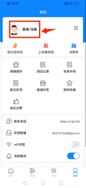 进入我的板块选择登录注册,完成账户验证流程。
