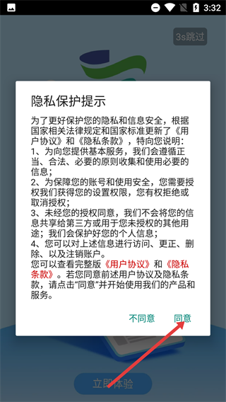 当【隐私保护提示】弹窗出现时,请先仔细阅读《用户协议》与《隐私条款》的相关说明,确认无误后点击【同意】按钮,即可继续使用本产品的各项服务。