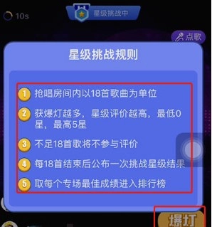 抢唱房间的比赛以18首歌曲为一轮,每位选手需通过抢麦来争取演唱机会,其余选手可对演唱者选择爆灯或灭灯。当18首歌曲全部完成后,获得爆灯次数最多的选手将赢得这场星际挑战的胜利。