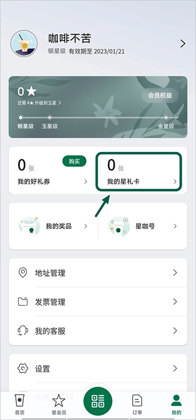1、首先打开星巴克应用,进入“我的”页面后,找到并选择“我的星礼卡”选项;