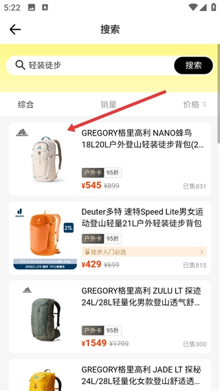 2、在分类页面,选择【背包专区】下的【轻装徒步】分类,进入对应的商品列表吧。