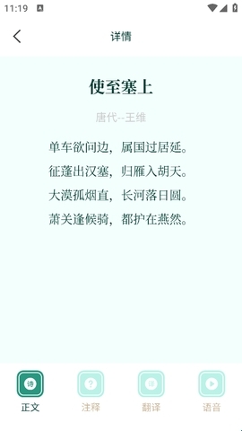 3、这首完整的诗就呈现出来了,同时配有相关的注释、翻译以及语音内容。