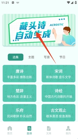 1、进入“古诗”页面后,点击该页面内的“藏头诗自动生成”功能按钮。