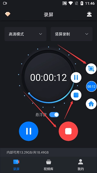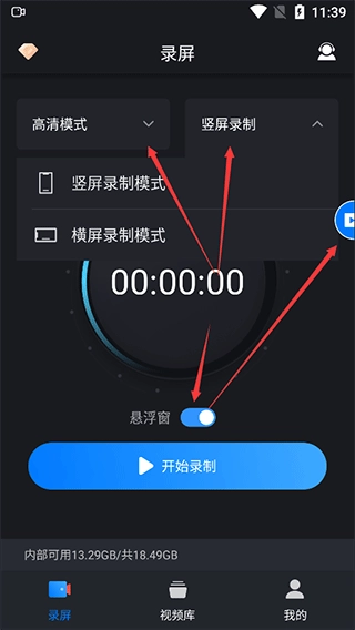 1、在本站完成安装后点击打开进入,选择合适的录屏模式与相关参数,录屏前建议开启悬浮窗功能,待所有准备工作就绪,点击开始录制即可。