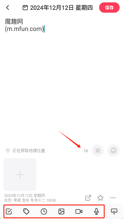 3、界面下方配备标签、时间、图片等功能模块,右下方区域实时显示当前已输入的字数。