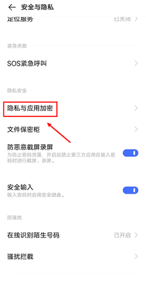 2、选择“隐私与应用加密”。