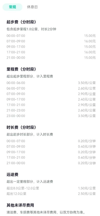 休息日的各项费用采用统一标准计费:起步条件为1公里里程且包含2分钟时长,对应起步费15元;里程费的收费区间是每公里2.6元至3.9元;时长费按照每分钟0.2元收取;当行驶里程超过12公里时,将额外加收远途费,标准为每公里2.5元。