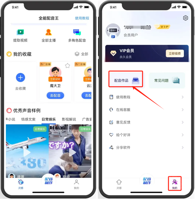 打开全能配音王应用,完成登录操作后,点击界面中的【我的】选项进入个人中心,接着在个人中心里找到并点击“配音作品”,就能查看已经制作完成的配音内容了。