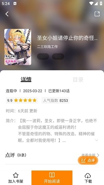 挑选你想观看的漫画,点击进入详情页面后,会看到简要的介绍内容,接着点击“开始阅读”按钮即可。