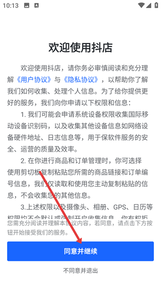 1、请先阅读【抖店】平台的【用户协议】与【隐私协议】,在充分了解其中关于权限申请的相关规则后,点击【同意并继续】按钮,即可进入下一步操作流程。