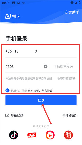 2、进入【抖店】的手机登录页面,输入手机号和验证码,勾选相关协议后,点击【登录】按钮,以此完成账号验证流程。