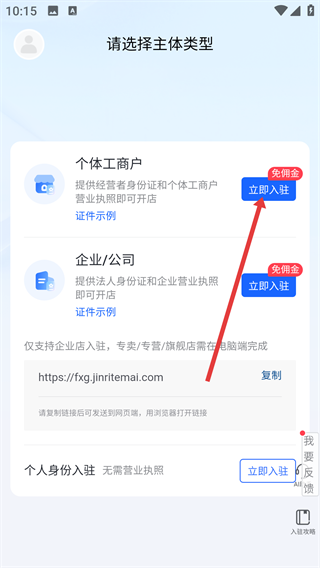 3、进入【请选择主体类型】界面后,找到并选择【个体工商户】这一选项,接着点击其对应的【立即入驻】按钮,即可进入该主体类型的入驻流程。
