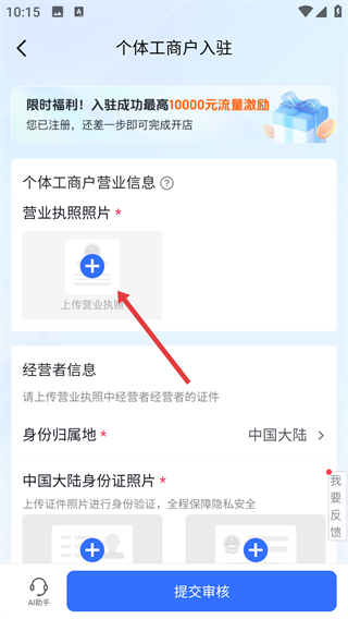 4、进入【个体工商户入驻】页面,点击【上传营业执照】板块添加所需材料,之后完善经营者信息并提交审核。