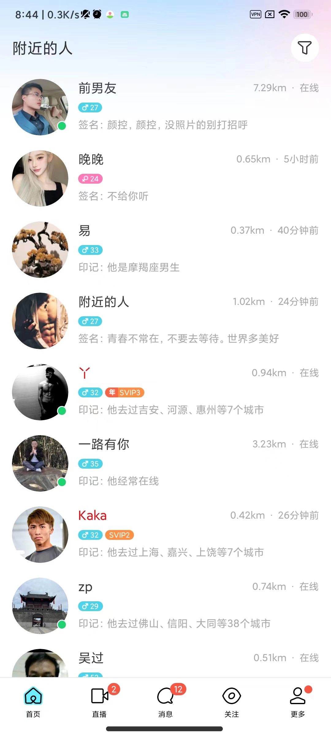 打开软件进入首页后,就能看到不少附近的人的相关信息。