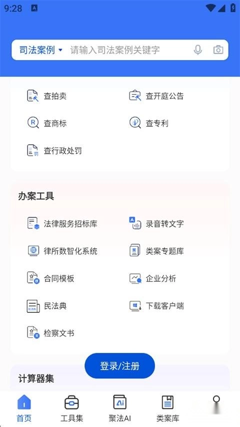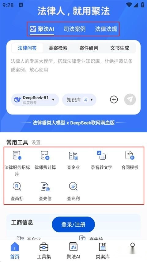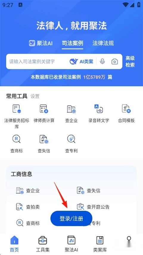 登录账号后,界面上方设有聚法AI、司法案例与法律法规三个模块功能,同时也能通过下方的常用工具查询各类法律问题。