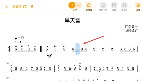 4、示范播放时,乐谱会同步呈现当前的演奏进度,你可以跟着这个进度更深入地熟悉曲目的各个细节。