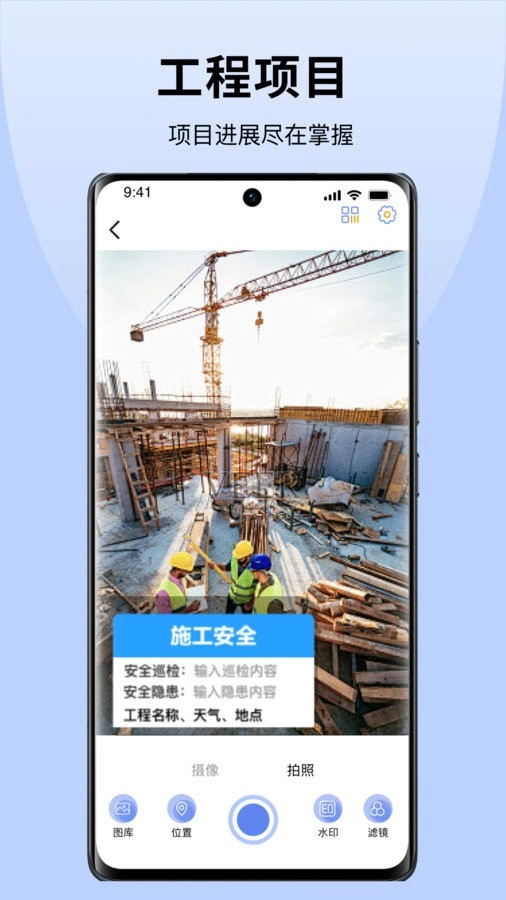 适用于工程项目管理场景,帮助用户实时了解项目推进情况,还能借助相机留存关键瞬间。