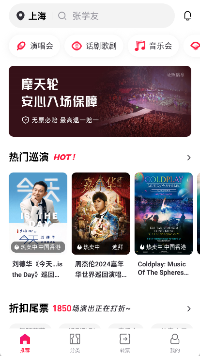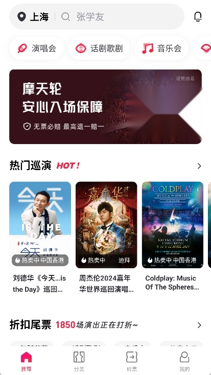 摩天轮票务是一款服务专业度很高的娱乐票务软件,能帮我们找到并买到心仪活动的门票,尽情享受一场场精彩绝伦的现场演出。目前它的服务范围已覆盖全国200多个城市,提供的票务类型十分丰富,包括演唱会、体育赛事、音乐会等多个领域。而且平台主打“折扣票”,让大家能用更少的花费欣赏到更优质的演出。另外,所有售出的票券都会经过严格的验票流程,保证票源绝对正规!